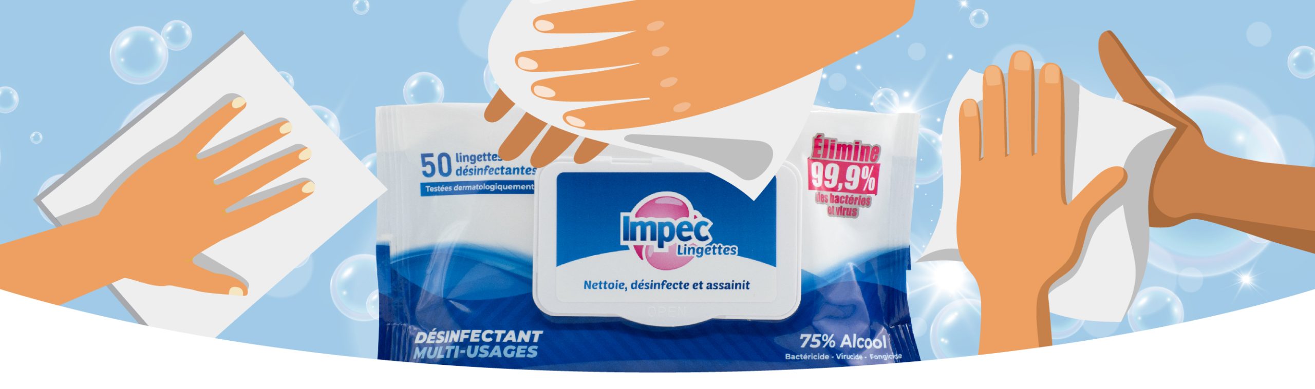 La lingette désinfectante Impec, qui contient 75% d’alcool peut être utilisée sur les poignées de porte, les interrupteurs, le clavier de l’ordinateur, la télécommande, etc.