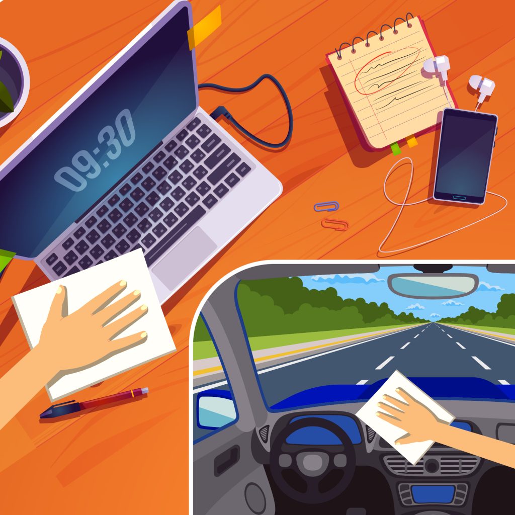 Attention à toujours bien nettoyer au préalable l’intérieur de la voiture avant de désinfecter et donc d’épousseter, de jeter les déchets, balayer au sol, d’aspirer les résidus présents sur les sièges et les tapis, de nettoyer la boîte à gants, etc.